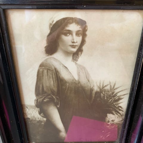 Med sit bibelske afsæt blev Ruth sanker aks en popular vægdekoration sidst i 1800-tallet. Billede i dekoreret ramme 32 x 48 cm.