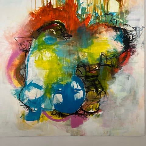 Abstrakt maleri med farverigt, ekspressivt motiv i blå, rosa, røde og hvide nuancer.