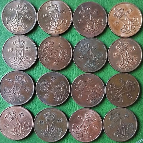 Danmark Mønter 10 ØRE 1973 - 1988 KOMPLET Margrethe II Prisen er for dem alle!!