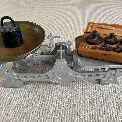 Gammeldags balancevægt i metal med to runde vægtskåle ophængt i kæder. Tværbjælken har ophæng i midten til montering i loft eller stativ. Velegnet som dekorativ genstand eller til simpel afvejning af mindre genstande. Materialet fremstår som messing med patina, som giver et ældre udtryk.