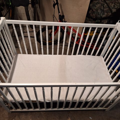 IKEA tremmeseng med tilhørende sengekant og en pose med sengetøj.