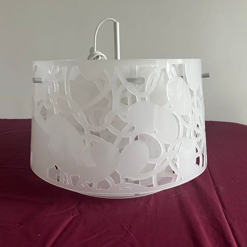 Louis Poulsen Collage pendel i hvid, designet af Louise Campbell. Lampen har en skærm opbygget af flere lag udskårne mønstre, som giver et diffust og blændfrit lys. Velegnet som belysning over spisebord, i køkken eller opholdsrum.