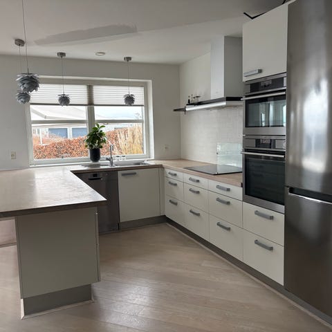 Køkkenet er pænt og velholdt, men dog med brugsspor. Enkelte greb er løse. Et enkelt overskab trænger til nyt hængsel da lågen et løs.