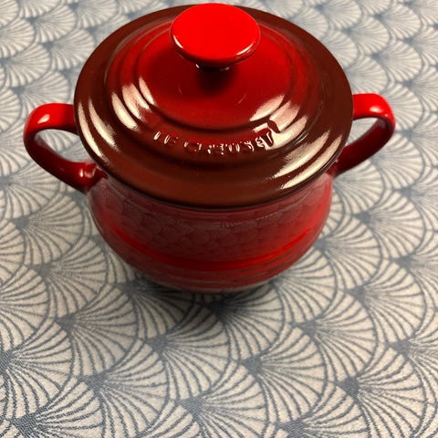Le Creuset skål med låg i rød stentøj. Skålen har lys inderside og matchende låg med knop. Velegnet til servering eller opbevaring af mindre portioner mad eller tilbehør. Fremstillet i glaseret stentøj, som er let at rengøre.