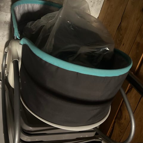 Skråstol i sort stof med metalstel. Stolen har sele foran til fastgørelse af barnet, og et enkelt, let stel, der giver en vuggende bevægelse. Velegnet som hvile- og siddestol til baby i hjemmet, f.eks. i stue eller børneværelse.