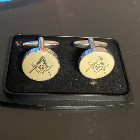 Frimurer - Manchetknapper med dødninghoved og knogler på hvid baggrund.