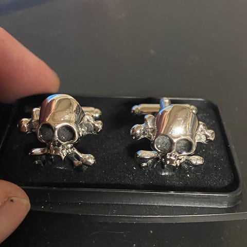 Frimurer - Manchetknapper med dødninghoved og knogler på hvid baggrund. - overskud går til maduddeling til hjemløse på Filippinerne.