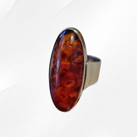 Rigtig fin sølvring med indsat rav klump sælges for 200,00 kr. Den er stemplet EST (Tror jeg) og 830S. Den har en indvendig diameter på 2 cm.