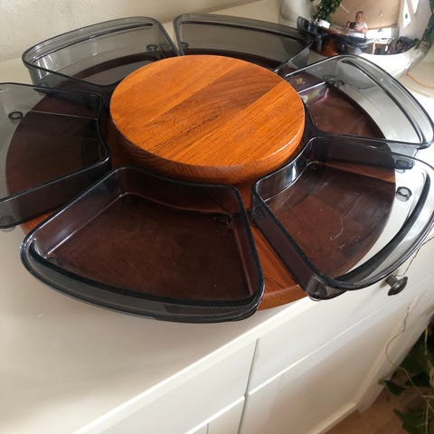Serveringskarusel i teaktræ. Er fin stand og uden fejl og mærker i træet.