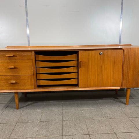 Skænk med tre skuffer og skydelåge, hylder og udtræksbakker med original maling, håndtag af aluminium og teak; bordplade med affaset kant. H. 64 B. 165 D. 42 cm.