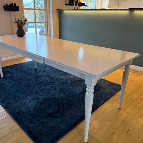 Sælger mit super fine spisebord fra IKEA i modellen Rosentorp, der med sit udtræk kan blive i alt 215 cm. Perfekt til gæster eller større familier. Se sidste billede for alle mål.