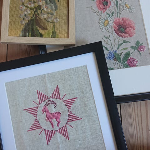 Sødt vintage blomster broderi fra 1950 i en fin gammel ramme. Bag på billedet har den oprindelige ejer skrevet små noter fra hverdagen.
