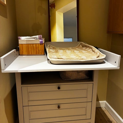 Puslebord Sundvik fra Ikea i hvid. Greb skiftet til messing. Sælges med puslepude fra sebra samt kurve til bleer og diverse. Malingen på puslebordet er skallet lidt af de billeder samt sebra puslepuden er misfarvet hvor det er blevet sprittet af, kan med fordel bruges med stofble over så ses det ikke.