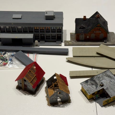 En stribe villaer i forskellig størrelse og stand. Et mejeri intakt i æske og skal samles.