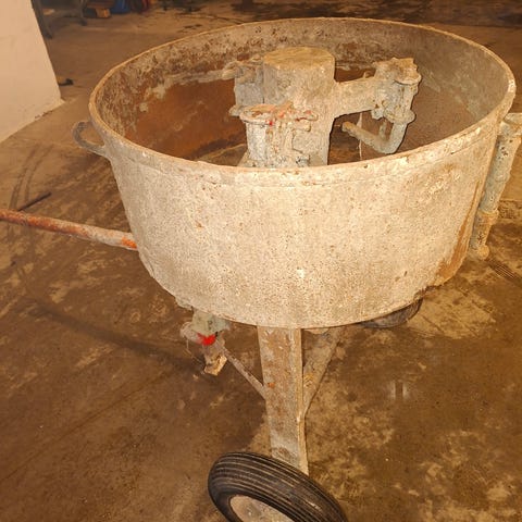 Tvangsblander betonblander i gul metaludførelse. Blander med lodret tromle og faste blandearme, egnet til blanding af beton, mørtel eller lignende materialer på byggeplads eller i værksted. Monteret på stativ med håndtag for flytning. Drevet af elektrisk motor placeret under tromlen. Velegnet til mindre og mellemstore blandeopgaver, hvor der ønskes en stationær løsning med tvangsblanding.