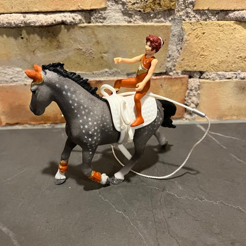 Schleich hest med rytter legetøjsfigur. Figuren forestiller en hvid hest med sadel og en akrobatisk rytter stående på ryggen.