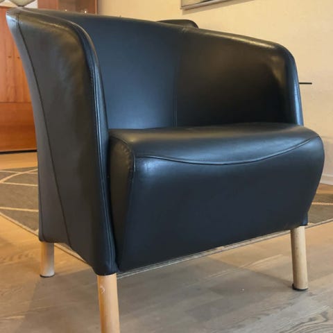 Både stol og skammel har lidt skrammer og stoffet under skamlen er revet lidt op (påvirker dog ikke rigtigt noget)