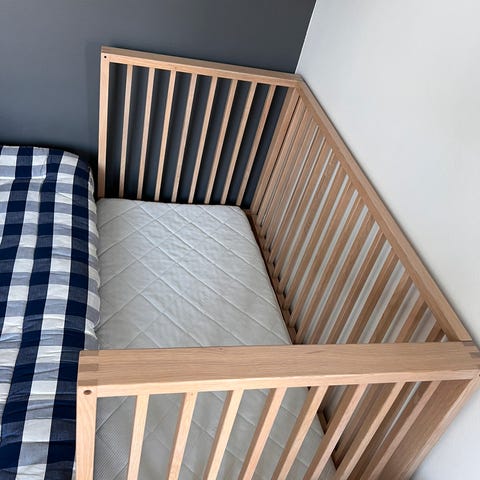 Madras, åndbar topmadras (hvis baby skulle lægge sig på maven), sengerand og lagen medfølger.