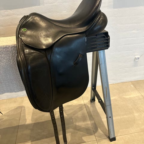 Lækker dressursadel i sort europæisk læder, 16” med udskiftelig medium kopfjern. Foam i sæde og puder som gør den behagelig for både rytter og hest, samt store knæpuder, til god støtte.