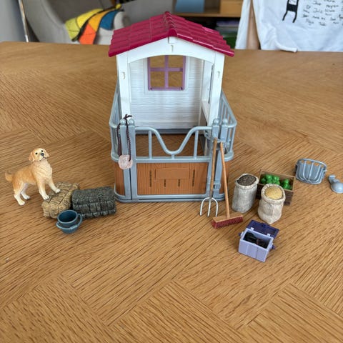 Schleich hegn og indgang til fold i plast. Sættet består af flere hegnselementer i hvid og beige samt en port/indgangsbue i matchende farver. Delene er beregnet til brug sammen med Schleich heste- og gårdlege, hvor de kan bruges til at indhegne folde eller opstille indgangsområde til stald eller gård.