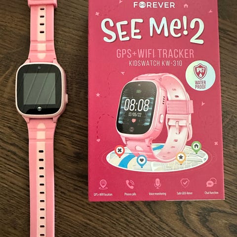 Forever See Me! 2 KW-310 børneur med GPS og wifi. Uret fungerer som kidswatch og tracker med GPS- og wifi-funktion til lokation. Modellen er i pink med silikonerem og digital skærm. På billederne ses ur, opladerkabel og original emballage medfølge.
