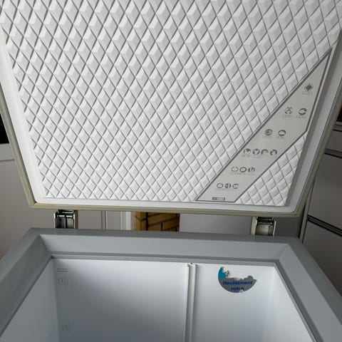 Vestfrost kummefryser i hvid. Fryseren har normal brugsslidtage og mindre buler på toppen