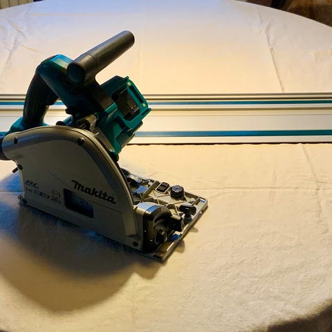 Makita dykssav med tilhørende føringsskinne i taske. Sættet omfatter dykssav, føringsskinne, tre spændeklemmer, ekstra savklinger samt batteri og Makita batterilader. Velegnet til præcisionssnit i træ og pladematerialer, hvor der er behov for styret og kontrolleret savning med føringsskinne.