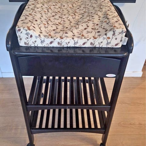 Stokke puslebord med opbevaring i lyst naturfarvet træ.