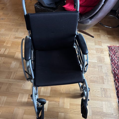 Sammenklappelig letvægtskørestol i rød aluminiumsramme med sorte sæde- og rygflader. Kørestolen har store baghjul med håndfælge og mindre forhjul for nem manøvrering. Den er udstyret med aftagelige, svingbare fodstøtter samt armlæn for ekstra støtte. Polstret sæde med velcro for montering af evt. ekstra pude. Egnet til persontransport i hjemmet eller på korte ture, skubbes af hjælper eller betjenes af brugeren selv. Der er tale om en ældre, men velfungerende kørestol med brugsspor.