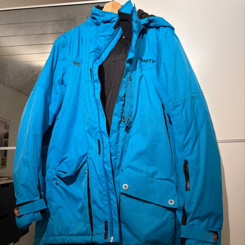 Craft skijakke i blå farve med hætte. Jakken har gennemgående lynlås foran, justerbar hætte med snøre og flere lynlåslommer. Indersiden har foring og snefang med justerbar snøre forneden. Ærmerne har justerbar lukning ved håndleddene. Velegnet som yderlag til ski og anden udendørs brug i koldt vejr.