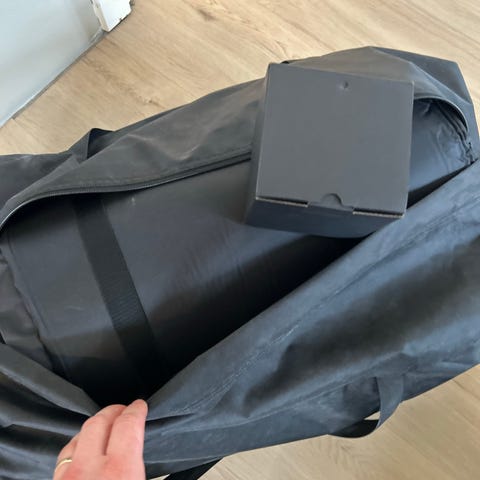 Kan foldes sammen og smides i den medfølgende taske der kan smides i frunken.