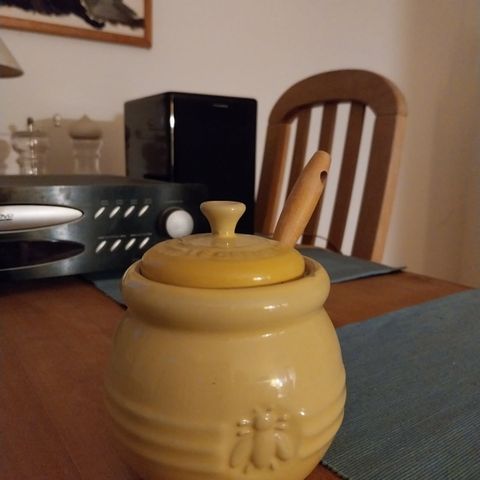 Super flot lysegrå / grå marmeladekrukke fra LE CREUSET - krukken er 14 cm. høj og 9 cm. i 4kant.