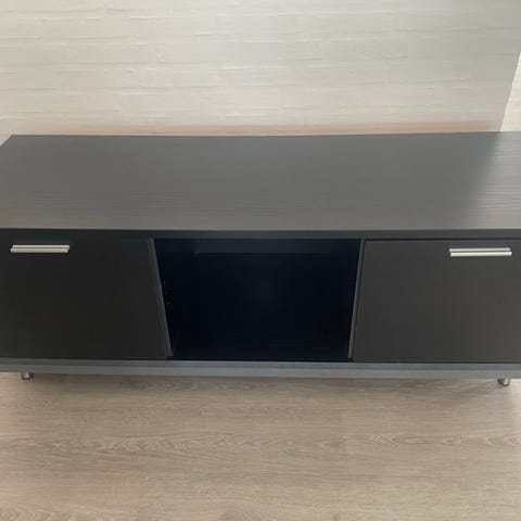 Skænk med skydelåger fra JYSK. Brugt som et TV-møbel. Mindre brugsspor/små ridser på den ene låge, som kan ses på det ene billede.