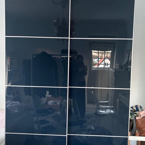 2 sæt med hver 2 sektioner. Hver sektion har 4 skuffer, 1 hylde, 1 bøjlestang. Der er 2 skydedøre pr set. Udvendige mål: dybde: 65 cm, højde: 202 cm og samlet længde 300 cm, dvs 150 cm pr set.