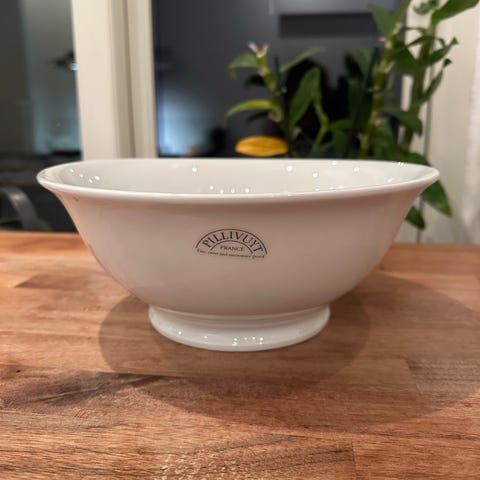 Billede 1: Pillivuyt ildfast fad, perfekt til 2 personer, passer til lille pose flødekartofler, eller 2 stykker kød, om det er bøffer eller koteletter.