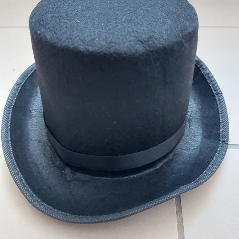 Sort høj hat fremstillet i 100 % polyester. Klassisk cylinderformet model med flad top og rund skygge. Egnet til udklædning, kostumer eller formelle lejligheder, hvor en høj hat ønskes som del af påklædningen.