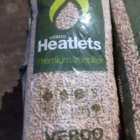 Træpiller i sække egnet til brug i pillefyr eller pilleovn.