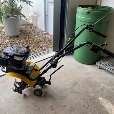 Adano MS45 fræser med benzinmotor i gul/sort udførelse. Maskinen har håndtag med betjeningsgreb og fræserknive foran, egnet til fræsning og kultivering af jord i have og mindre køkkenhaver. Velegnet til arbejde i bede, køkkenhave og andre mindre jordarealer, hvor der er behov for at løsne og bearbejde jorden.