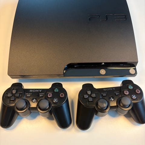 Sony Playstation 3 konsol med 2 controllere og tilhørende kabler. Medfølgende flere PS3-spil i originale covers, herunder blandt andet sportsspil, actionspil og eventyrspil.