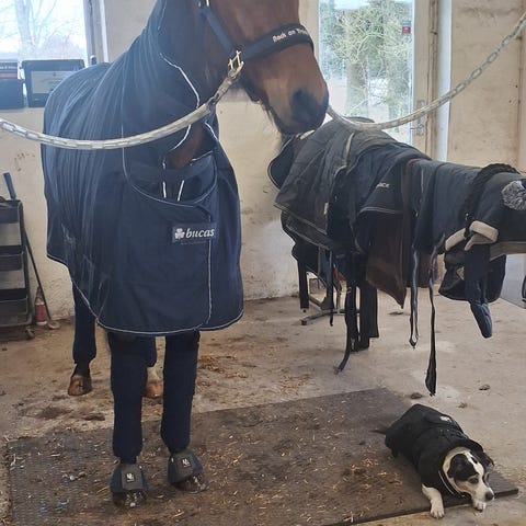 Vi har haft ham i 2 et halvt år, men han er kørt surt I bane ridning, og med hans alder fortjener han nu at gå lidt på "pension " i skov og natur i stedet for sandkasse. Han skal ud og blive en glad hest igen, han fortjener kun det bedste.