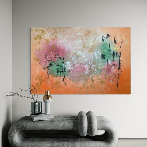 Abstrakt maleri på lærred i blå, turkise, grå og brune nuancer. Maleriet er rektangulært og vertikalt orienteret og egner sig til ophængning over sofa, hylde eller andet møbel i stue eller opholdsrum. Overfladen har tydelige penselstrøg og lag af maling, som giver et struktureret og dynamisk udtryk.