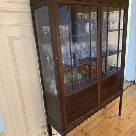 Vitrineskab i træ med glaslåge på fronten. Skabet har flere indvendige hylder til opbevaring eller udstilling af genstande. Klassisk design med drejet trædetalje ved siderne og en mindre sokkel nederst, der kan fungere som ekstra afsætningsplads. Egnet til brug i stue, spisestue eller køkken til opbevaring af service, glas eller dekorative ting.