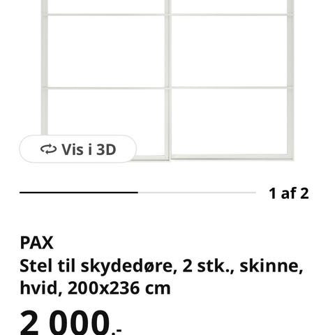 Sælger to stk skydedøre i målene 101 cm i bredden og 231 cm i højden, pr stk. Passer til Pax fra IKEA. Fejler intet og fremstår flotte.