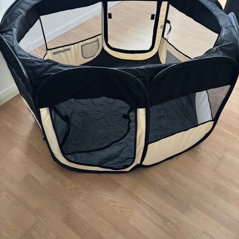 Kravlegården er som ny, kun forsøgt brugt meget få gange, men blev aldrig en succes fa vores hvalp endte med at være i køkkenet som man også kunne lukke af.