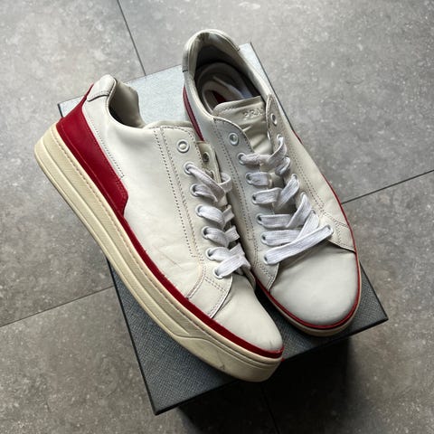 Prada sneakers i str. 38. Modellen er en lav, klassisk sneaker i sort med hvid sål og gummiforstærket snude. Overdelen fremstår glat og enkel med snørelukning og diskrete Prada-detaljer på pløsen. Velegnet til hverdagsbrug og afslappet stil.