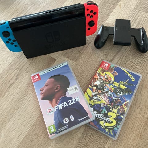 Nintendo Switch konsol med Joy-Con neon rød/blå og Nintendo Switch Sports