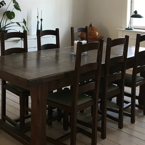 Lækkert håndlavet fransk spisebord, i massiv sæbebehandlet egetræ, 20 år gammelt, med tilhørende 8 stole 🪑 uden armlæn, samt en hovedstol med armlæn. Bordet står fuldstændig som nyt, da bordpladen er blevet passet godt på. Der er