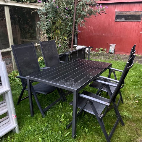 Lille havesæt/altansæt bestående af et bord og to stole i hvidmalet træ. Bordet er rektangulært med lameller og klapfunktion, så det kan stilles tæt ind mod væggen og fylde minimalt på altanen. Stolene har armlæn og sæde samt ryg i lameller. Sættet egner sig til mindre altaner eller terrasser, hvor der er behov for et kompakt cafésæt til udendørs brug.