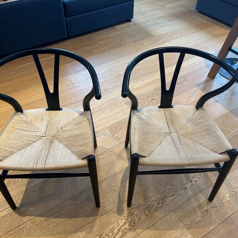 Carl Hansen spisebordsstol designet af Hans J. Wegner. Stolen har karakteristisk buet ryg og armlæn samt flettet sæde i naturfarvet materiale. Stellet er lakeret træ i mørk farve. Velegnet som spisebordsstol eller som ekstra siddeplads i stue eller køkkenalrum.