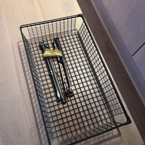IKEA trådkurv i hvid metal. Kurven er åben i toppen og har gitterstruktur på alle sider og bund. Egnet til opbevaring i garderobe, skab, reol eller bryggers, f.eks. til tøj, tekstiler eller andre mindre genstande. Kan bruges alene eller som del af et reolsystem, hvor den kan trækkes ud som en skuffe, afhængigt af indretning.